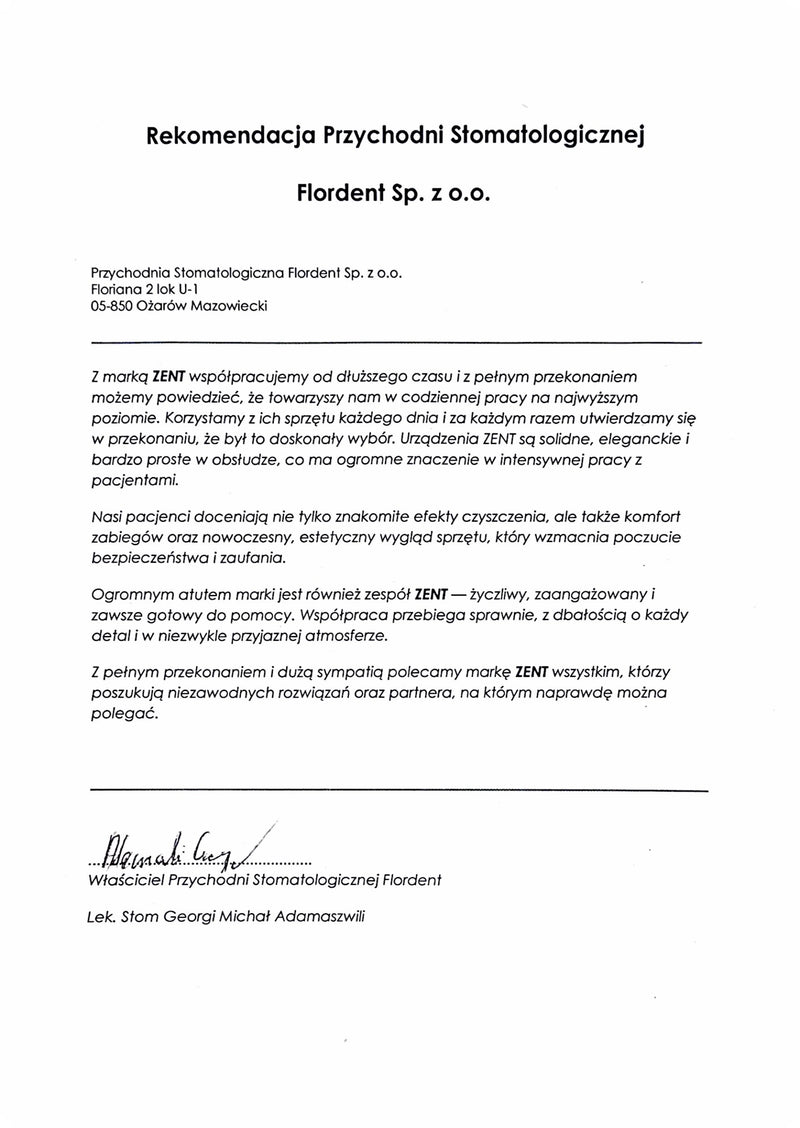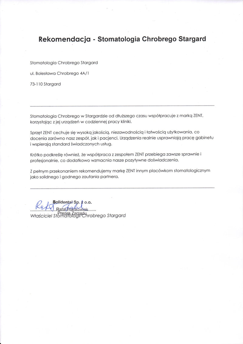 Wir verwenden seit längerer Zeit Produkte der Marke ZENT und können mit voller Überzeugung sagen, dass es sich um Geräte handelt, auf die man sich jeden Tag verlassen kann. Die Geräte sind robust, bequem und einfach zu bedienen. Unsere Patienten betonen oft, dass sie den Umstand schätzen, dass es sich um eine polnische Marke handelt, die hohe Qualität und lange Garantie bietet. Wir empfehlen ZENT gerne als zuverlässigen und vertrauenswürdigen Partner.